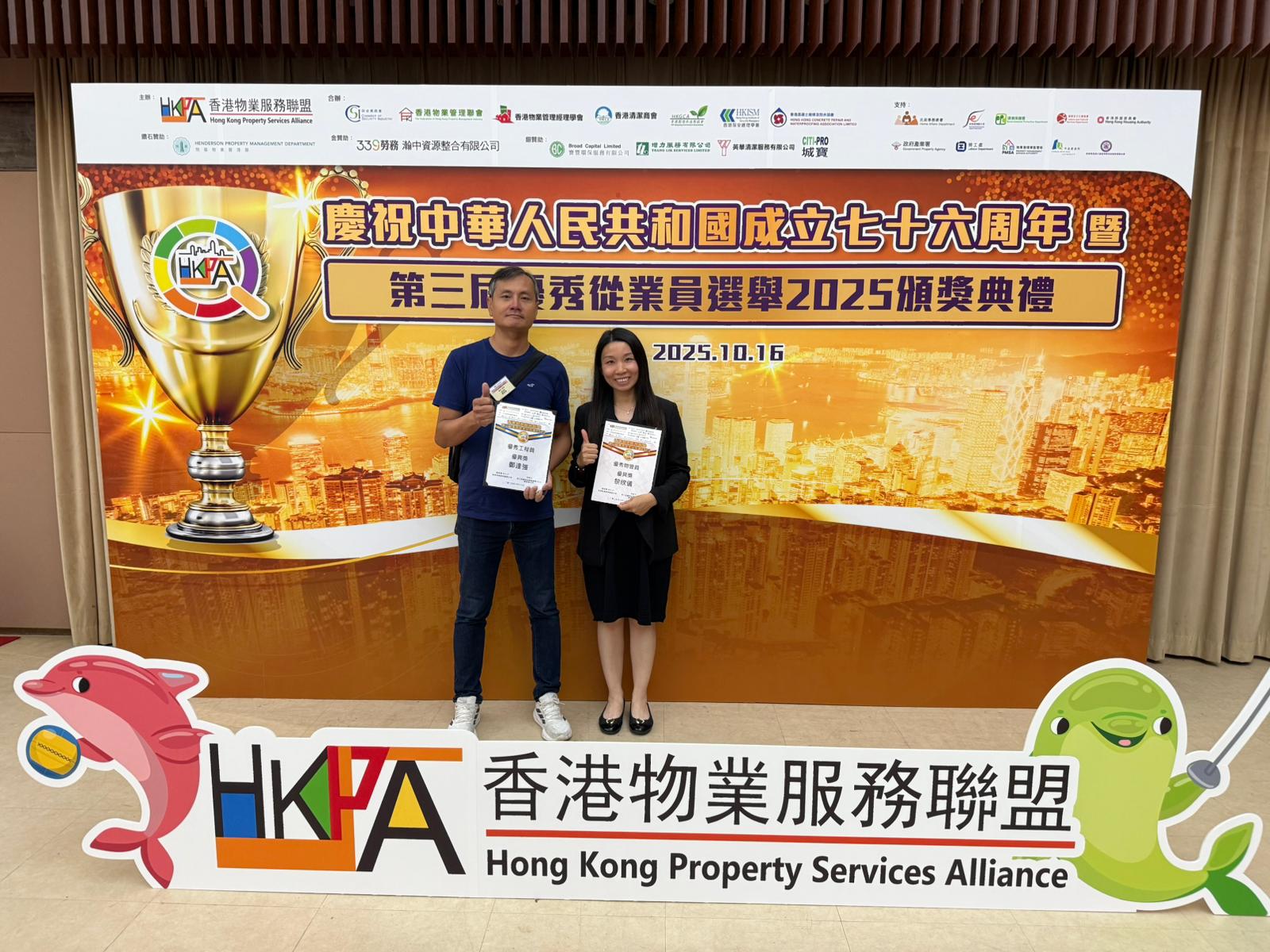 2025年10月16日,华润物流干仓业务两名员工在第三届香港物业服务联盟优秀从业员评选中荣获殊荣。华润国际物流中心仓库维护技师郑达强获颁“优秀工程员”称号,上水货仓管理处经理黎欣仪获评为“优秀物管员”。