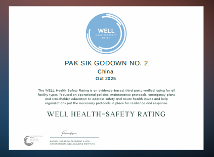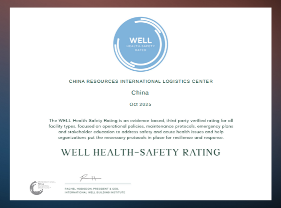 2025年10月22日,华润物流(百适企业)有限公司旗下管理物业百适二仓、华润国际物流中心成功获得由国际WELL建筑研究院(IWBI)颁发的WELL健康-安全评级认证(WELL Health-Safety Rating),其中华润国际物流中心亦同步将于11月获得"Leadership in Energy and Environmental Design "认证。此次双重认证标志着华润物流(百适企业)有限公司成为香港少数获此国际权威健康安全认证的企业之一。