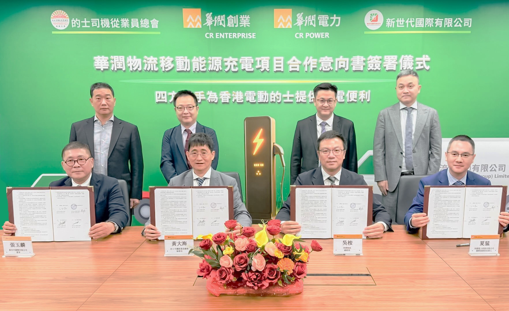 12月5日,华润物流与华润电力、的士司机从业员总会、新世代国际有限公司在香港签定充电业务合作意向。华润创业副总裁褚卓伦、华润电力副总裁马力、的士司机从业员总会秘书长黄大海、新世代国际有限公司董事张玉麟等出席活动。